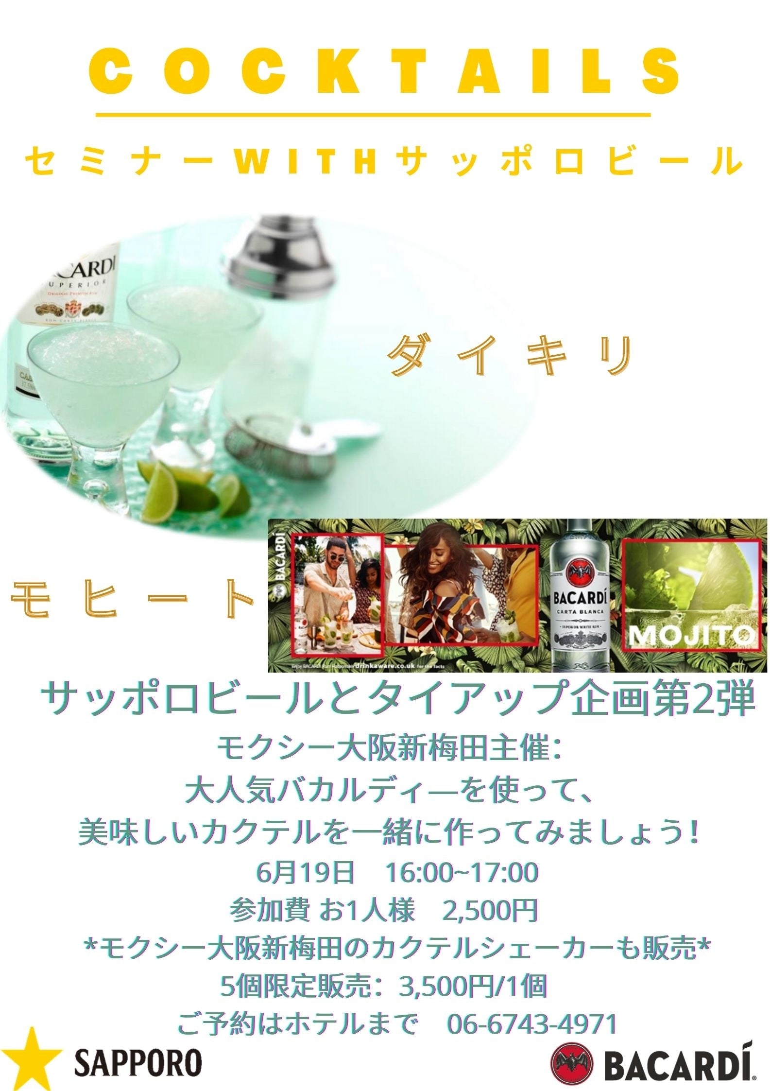 モクシー大阪新梅田(所在地:大阪府大阪市福島区福島7丁目22-1 ホテル支配人:友田 真里)は2022年6月19日(日曜日)にモクシー大阪新梅田主催:カクテルセミナーを開催いたします。 サッポロビール株式会社様からのご協力もあり、 バカルディ―を使用した美味しくて手軽に作れるカクテルをご紹介いたします。