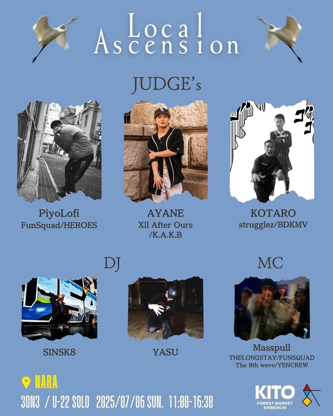 林業を始めるきっかけとなった下市町へ感じたご縁を、何かしらの形にして表現したいという思いのもと、普段から愛用しているKITOの1周年祭とコラボし、世間的にも認知が広がってきているブレイキンのイベントを開催することで、下市町を盛り上げるためのブレイキンバトルイベント「Local Ascension」を企画。*Ascension=上昇