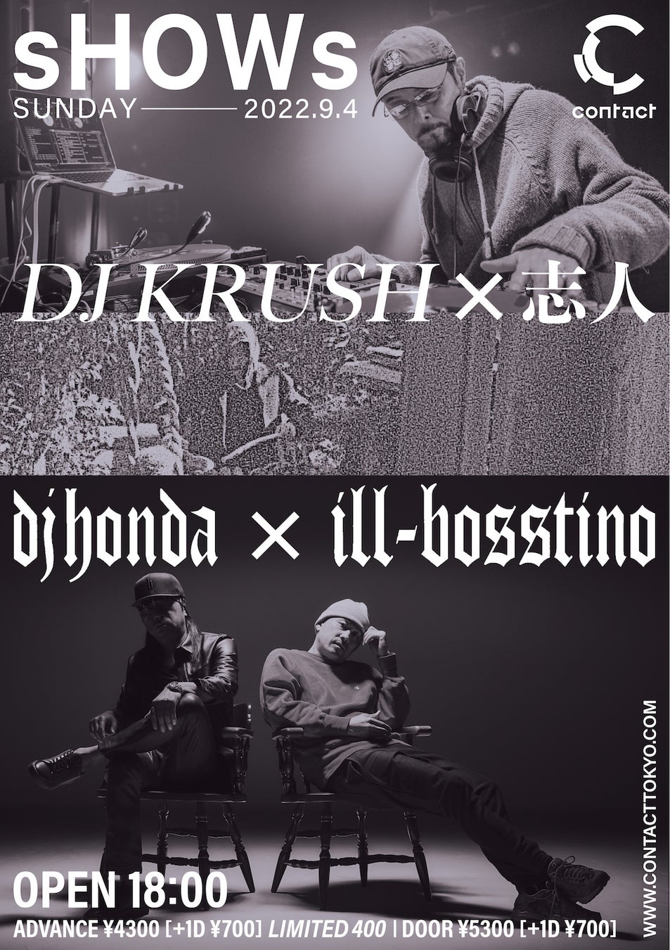 ヒップホップシーンの孤高、dj honda、THA BLUE HERBのill-bosstino、DJ KRUSH、志人が、閉館目前のContactのメインフロアで交わる!