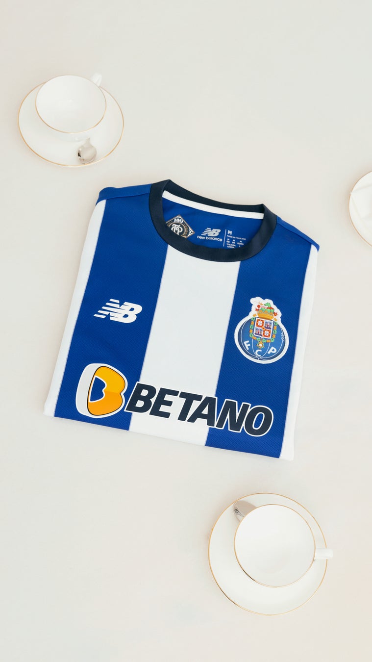 ホームユニフォームは、クラブ創立130周年を迎えたFCポルトのファンであることを祝福するために、青と白のストライプに新しい命を吹き込みました。伝統と革新を融合させ、ストライプのデザインにジャカードメッシュを織り込んで通気性を高め、ネイビーのクルーネックがスマートな仕上がりになっています。ニューバランスは、2023/24シーズンのすべてのユニフォームに最先端の設計技術を適用し、優れたパフォーマンスを提供します。湿気を逃がすブランドの革新的な素材「NB DRY」テクノロジーを使用して開発されたこのユニフォームは、90分間、そしてそれ以降も、プレーヤーがフレッシュでドライな状態を保つことをサポートします。スタイリッシュなアシンメトリーデザインを採用しており、胸にはFCポルトの象徴的なエンブレムと、ニューバランスの3D効果によるフラットな熱転写ロゴが配されています。FCポルトのホームユニフォームは、ポルトの象徴的なカフェ文化にインスパイアされたセットデザインで撮影しました。またヘッドラインメッセージ「Immortal by right」は、新しい2023/24シーズンの、世界中のFCポルトファンをつなぐ普遍的な感情を示しています。