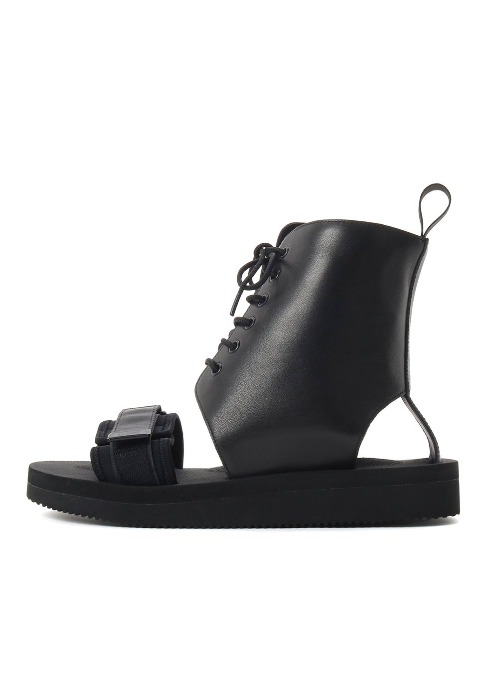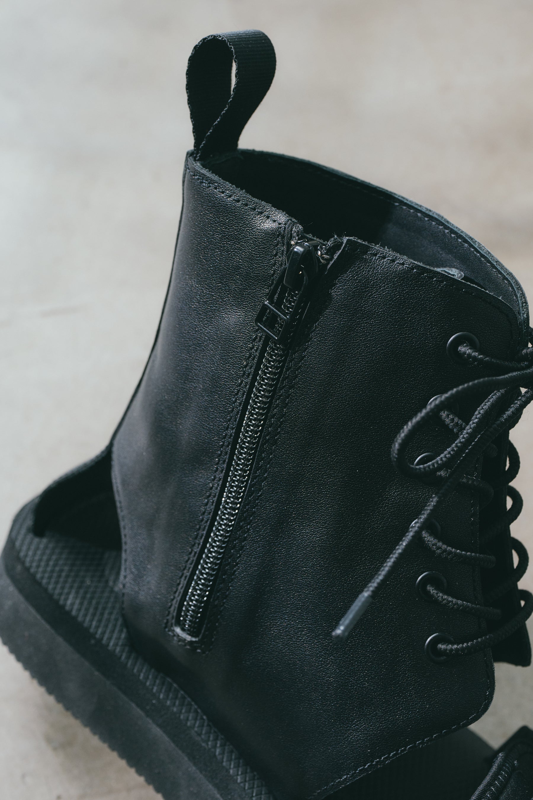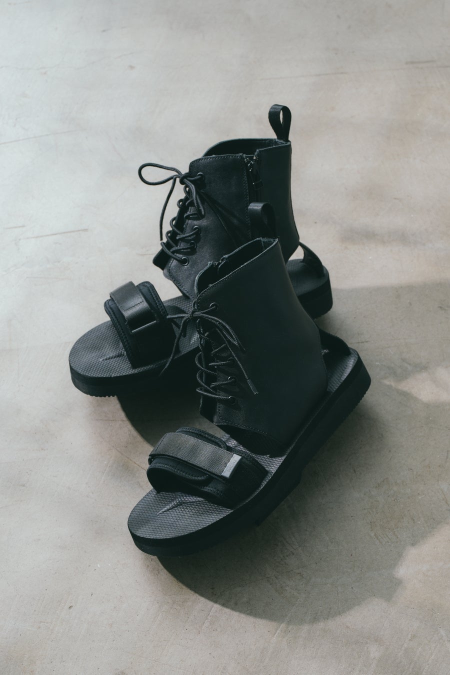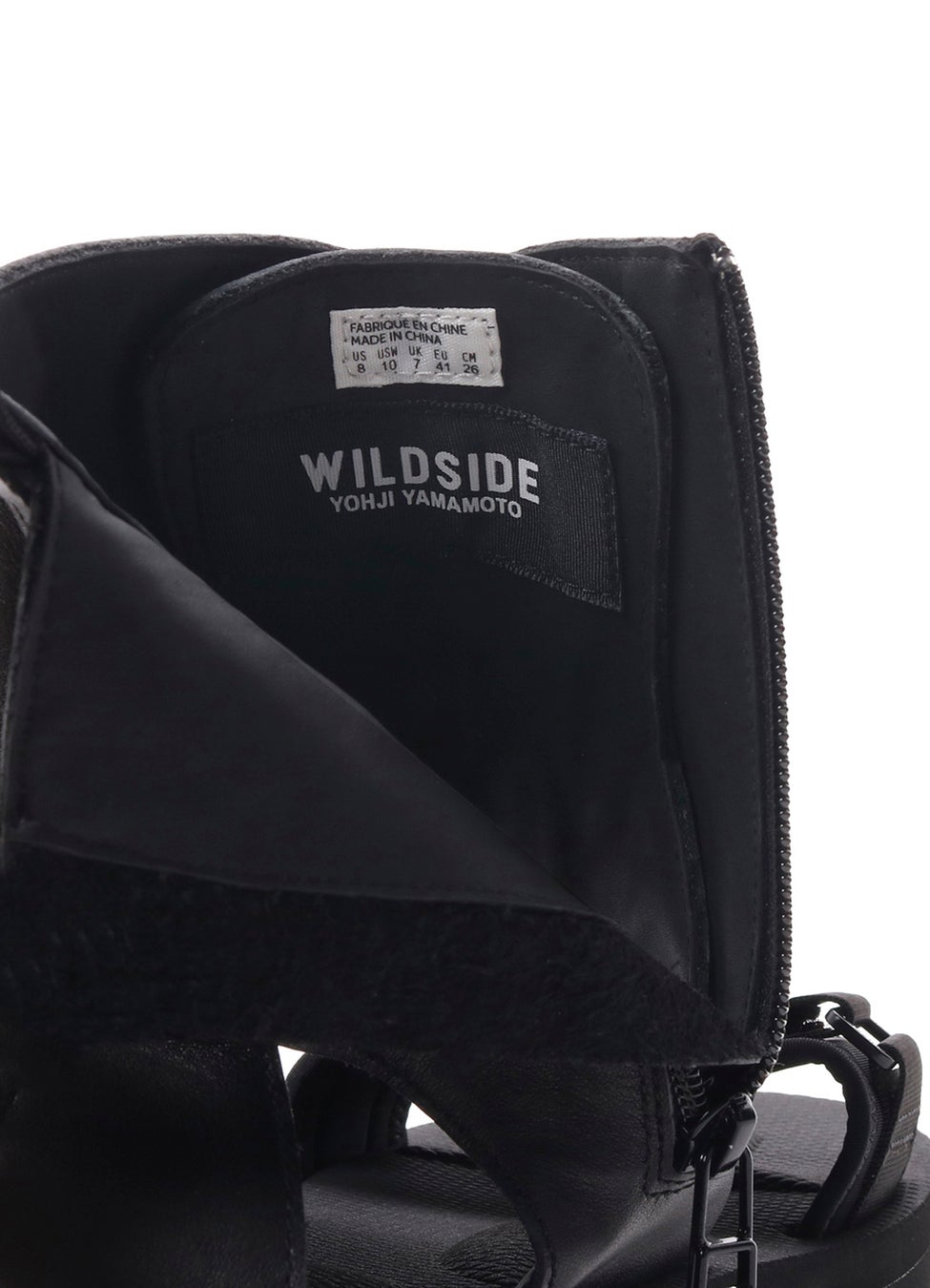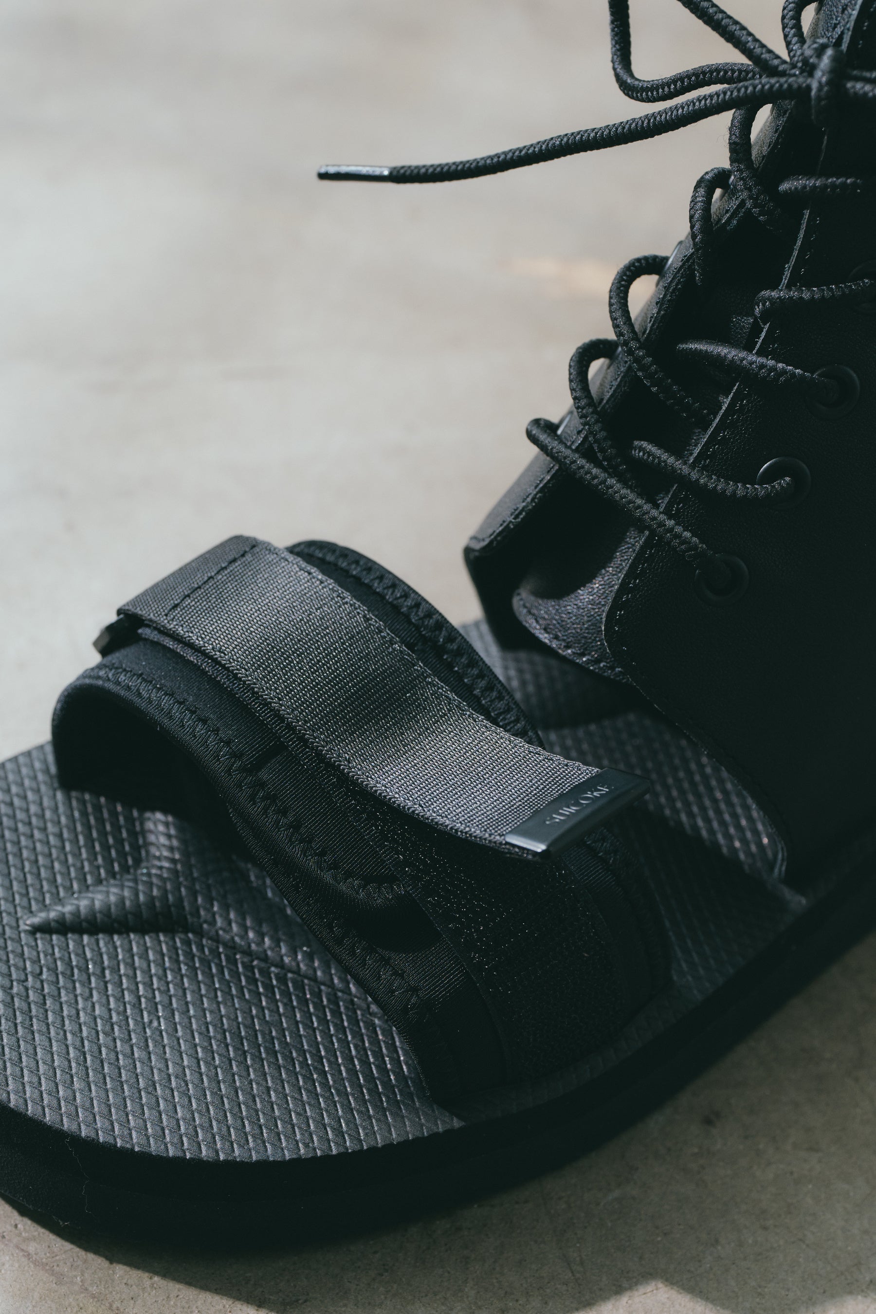 初のコラボレーションでは、株式会社ヨウジヤマモトのブーツ型サンダルのデザインをベースに、SUICOKEが得意とする機能性を融合させた特別な一足が登場します。アッパーには上質なカウレザーを採用し、オールブラックのカラーリングで統一。ミニマルでありながら存在感のあるデザインに仕上げることで、WILDSIDEの世界観を体現しています。