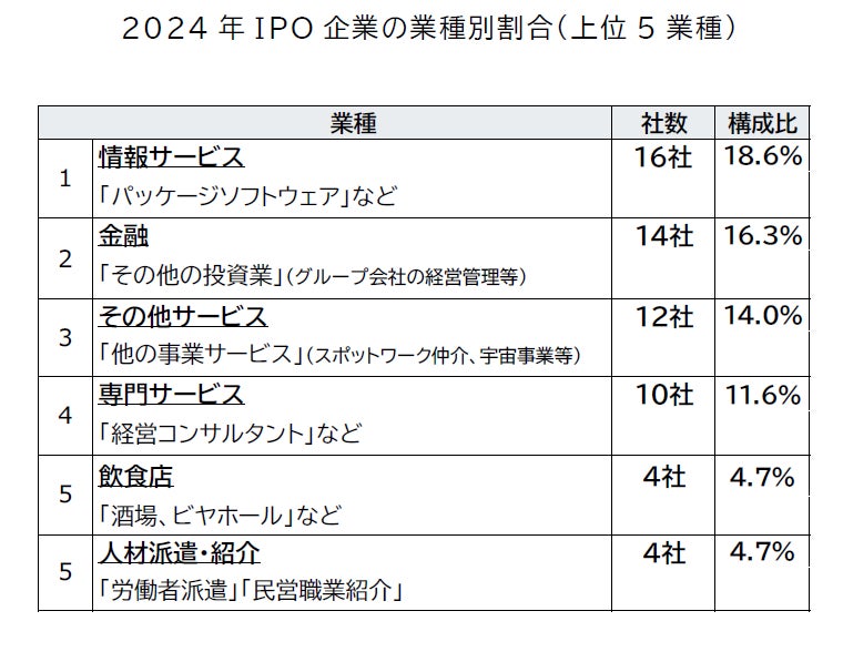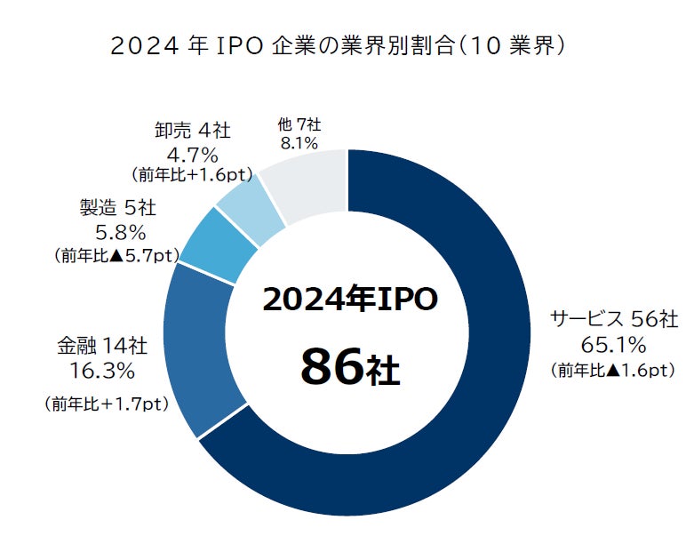 こうした市場環境のなか、2024年のIPO社数は前年から10社減少して86社となった。業種別にみると、AIやDXソリューション事業を手がける企業が多くみられたほか、深刻な人手不足などを反映して人材関連サービスも目立った。