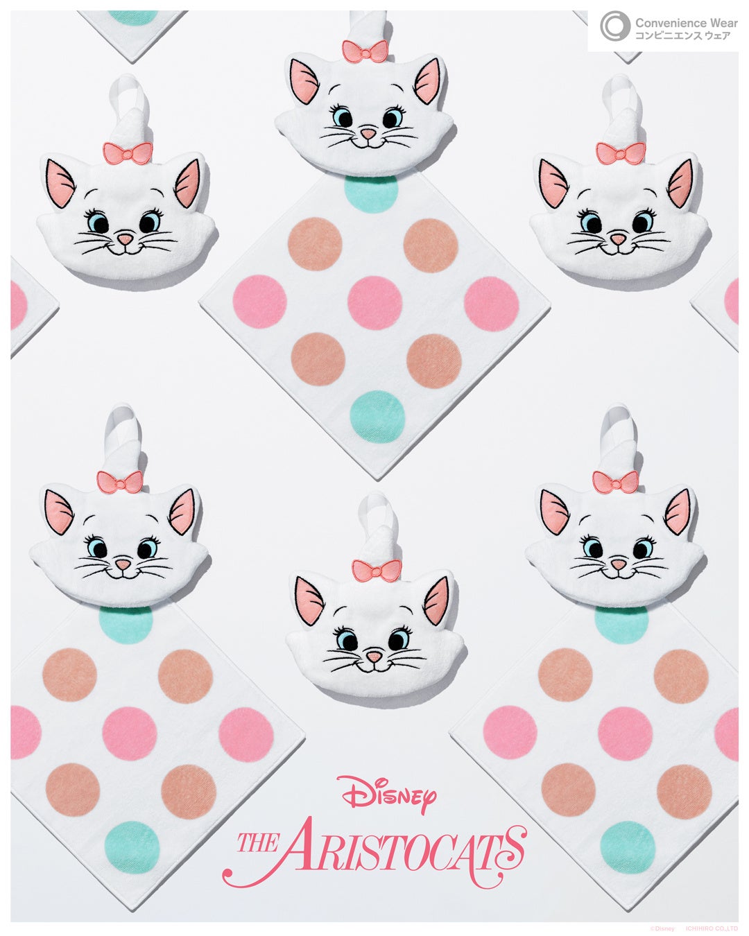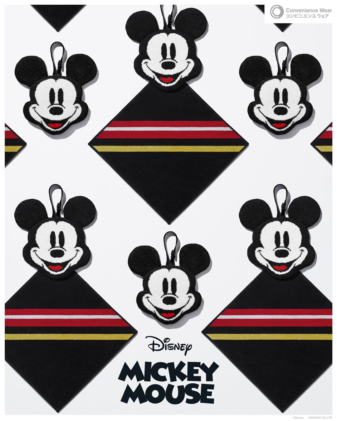 クラシックなミッキーマウスと、『おしゃれキャット』でおなじみのマリー、それぞれのイメージをタオルに落とし込み、コンビニエンスウェアでしか手に入らないオリジナルデザインに仕上げました。