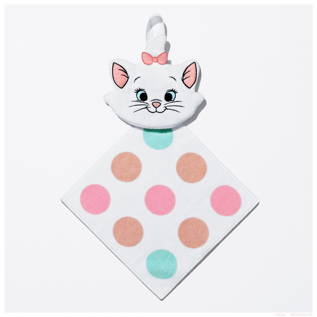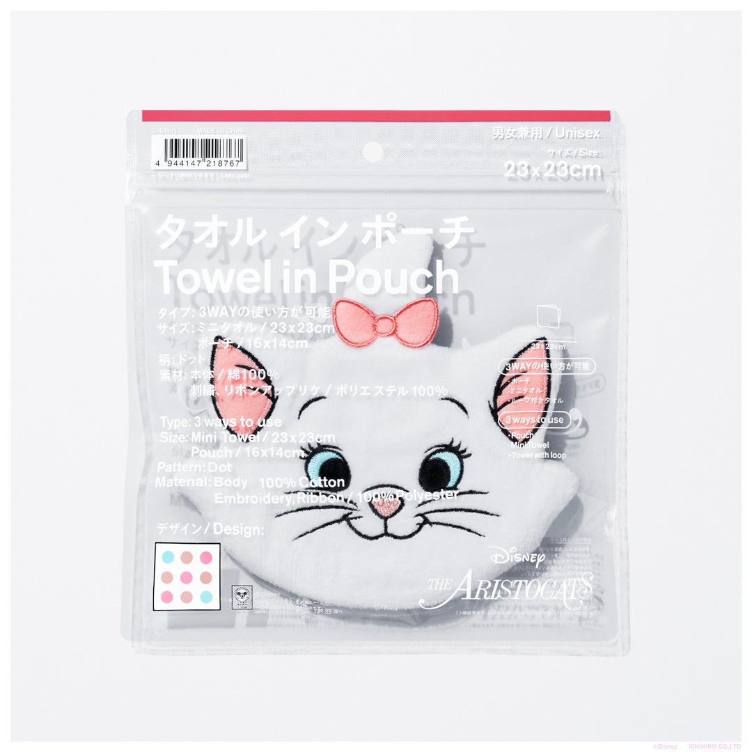 【内容】マリーの3WAYタオルインポーチです。タオルは、マリーのリボンと耳、目の色をイメージしたドット模様をデザインしました。