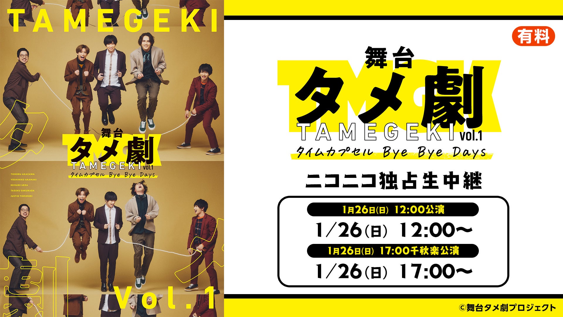 荒牧慶彦が企画・プロデュース、植田圭輔が演出を手がける舞台タメ劇vol.1『タイムカプセル Bye Bye Days』1月26日(日)千秋楽2公演を、ニコニコ生放送にて独占生中継を実施することが決定いたしました。
