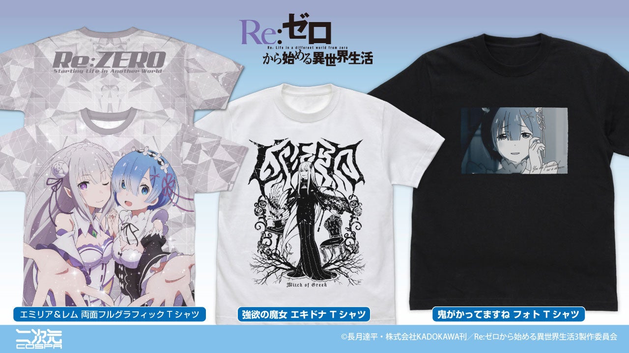 『Re:ゼロから始める異世界生活』より、エミリア&レム 両面フルグラフィックTシャツ をはじめ、 印象的なあのシーンをフォト風に切り取った 「鬼がかってますね フォト Tシャツ」 などの新グッズが二次元コスパから登場です。