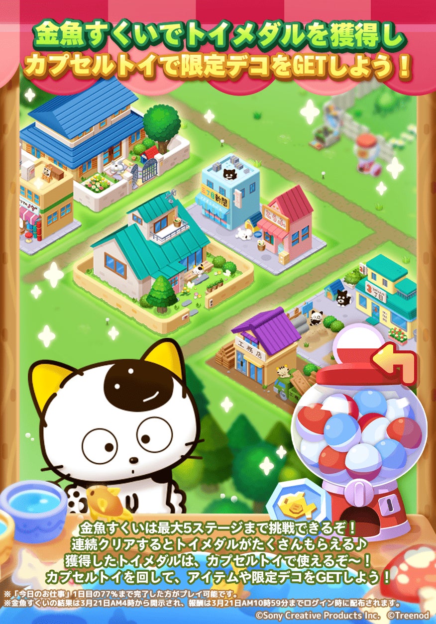 期間限定で、『タマ&フレンズ~うちのタマ知りませんか?~』をモチーフとしたコラボオリジナルの広場デコが13種類、駅デコが6種類登場します。金魚すくいで「トイメダル」を集めてカプセルトイを回し、イベントをクリアすることでコラボオリジナルデコが入手可能です。