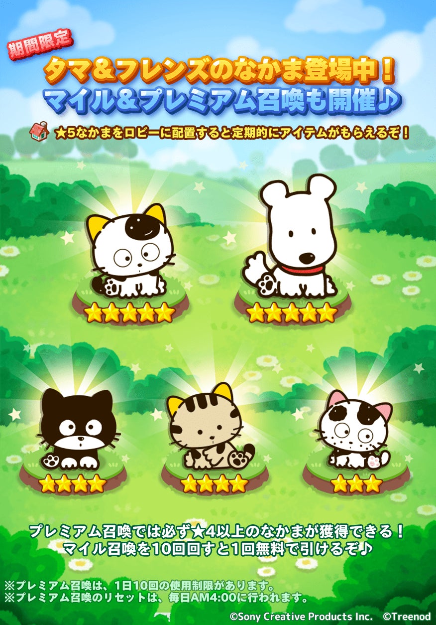 コラボ期間中に『タマ&フレンズ~うちのタマ知りませんか?~』のなかまたちが「LINE ポコパンタウン」に大集合します。「★5タマ」「★5ポチ」「★4トラ」「★4ベー」「★3モモ」「★3コマ」の5キャラクターがポコパンタウンに登場します。なかま召喚やイベントクリア時など、様々なところでなかまにできます。