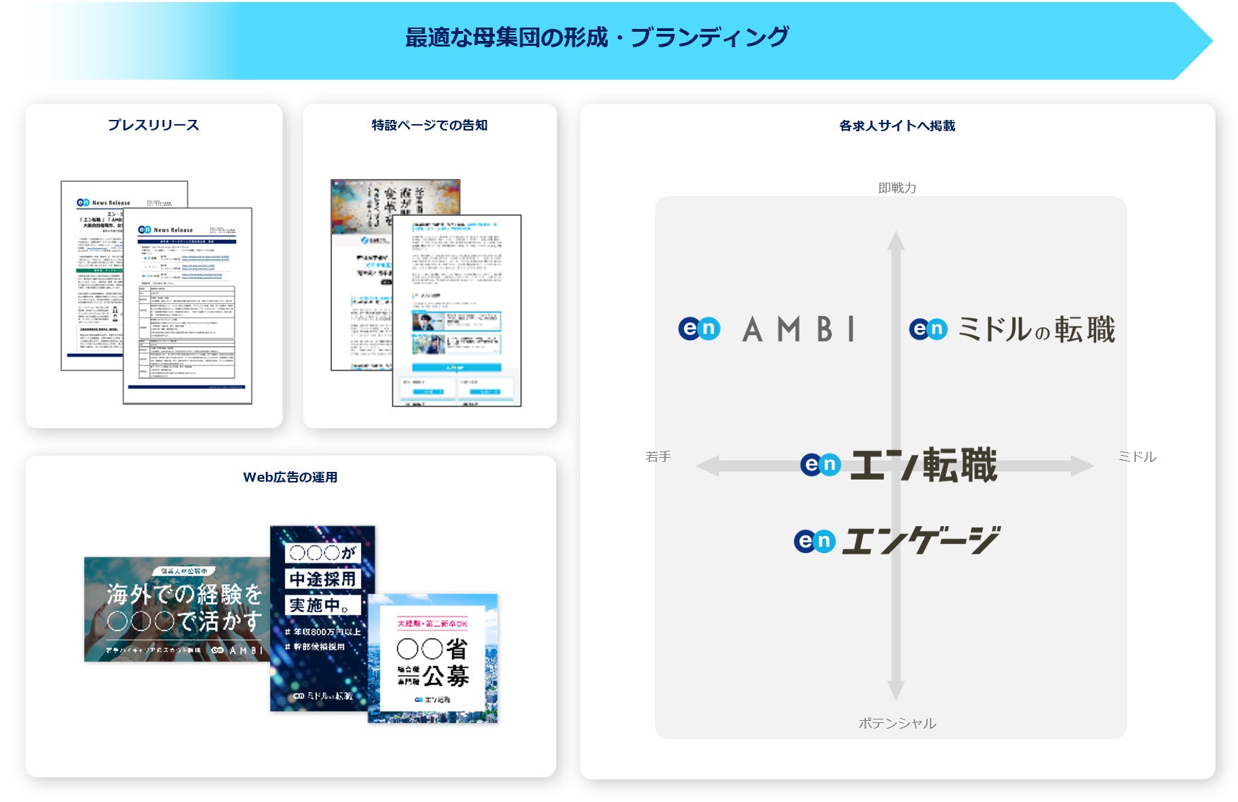 プレスリリースや特設ページ、Web広告での告知に加え、各求人サイトでの集客支援を実施。『ミドルの転職』『AMBI』『エン転職』『エンゲージ』とターゲットの異なる求人サイトを活用することで、ターゲットへ網羅的に求人を届けます。
