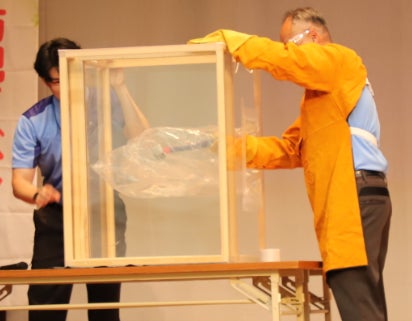 『七夕防犯イベント』の第一部では、一日警察署長の玉置恭一が、近年凶悪化する侵入犯罪に対する防犯対策の重要性を説明。その後、サービスマスター事業※2から対策のひとつとして「防犯フィルム」の有用性を示すデモンストレーションを実施しました。続く第二部では、園児を迎え、「ダス犬(ケン)」が大阪府警のシンボルマスコット「フーくん・ケイちゃん」が、港警察署員の方々とともに、生活安全や交通安全について、クイズ形式で楽しくお伝えしました。最後には、全員で願いをこめた短冊を大きな笹に飾り付けました。
