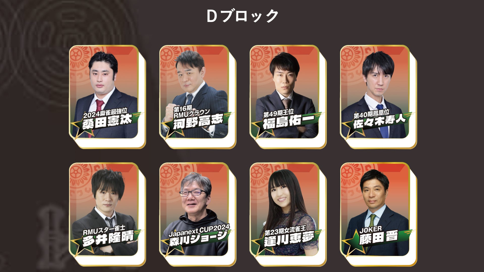 予選Dブロック1回戦には2名のMリーガーが出場します。「最速最強」「麻雀星人」などの異名を持ち、Mリーグ屈指の実力者で、渋谷ABEMASの多井隆晴。2025-26シーズンから参戦する新チームのEARTH JETS(アースジェッツ)所属となった逢川恵夢。さらに、今大会の前身にあたるJapanext CUP2024にて、名だたるプロたちの中から優勝した「はじめの一歩」の作者・森川ジョージ。そしてジョーカーとして、サイバーエージェントの藤田晋社長が出場します!Mリーグチェアマンの藤田は、渋谷ABEMASの監督を務めていた経歴もあり、雀士・経営者として、どのような麻雀を打つのか注目が集まります!