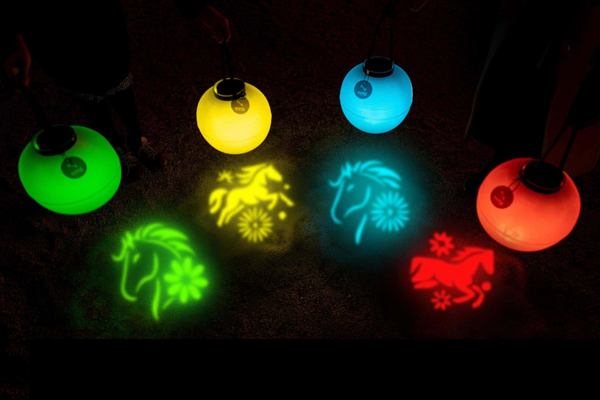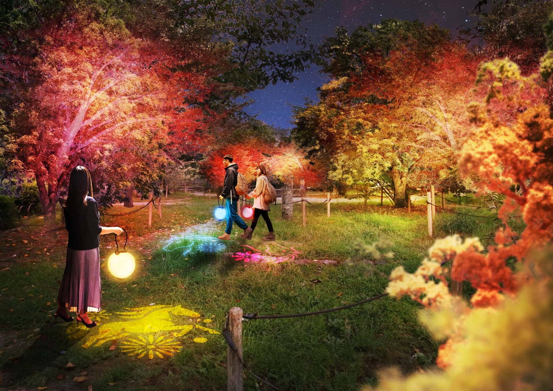 秋の草花に包まれた京都・円山公園で、光る馬が夜空を駆け抜ける