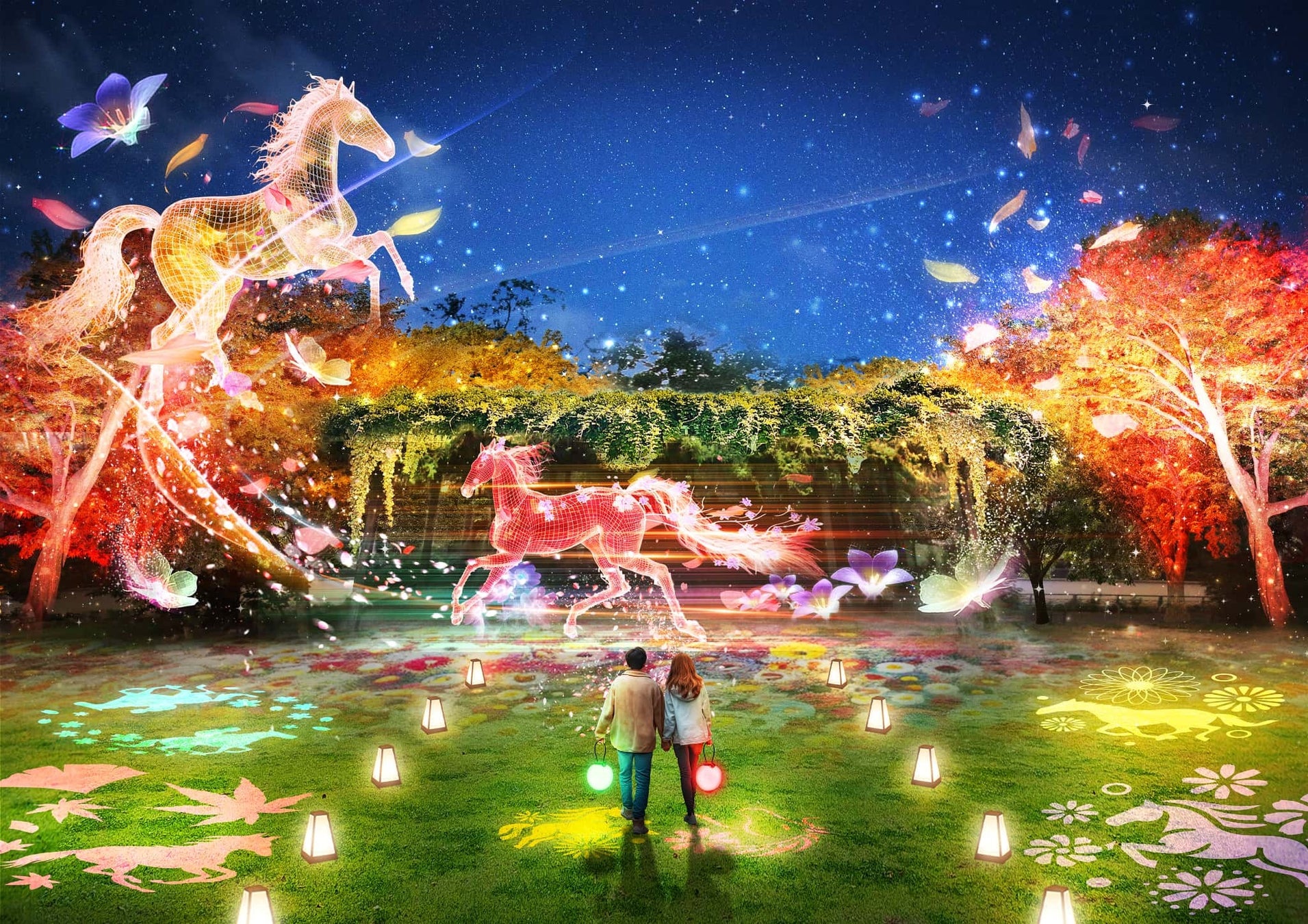 今年度の会場は、京都を代表する紅葉の名所のひとつであり、京都の中心街・祇園そばに位置する円山公園(まるやまこうえん)。円山公園の紅葉ライトアップ、馬が駆けるひずみの音や、秋の草花のデジタルアートなどを組み合わせ、馬の美しさや競馬の魅力を表現した秋ならではの幻想的な空間が出現します。ハイライトとなるのは、全長12mの藤棚。ライトアップされた藤棚とともにプロジェクションマッピングで光の馬が夜空を駆け抜ける圧巻の景観をお届けします。また、来場記念として、光の馬との写真撮影も。大人から子供まで一緒に楽しめる、おでかけ先としてもお楽しみいただけます。