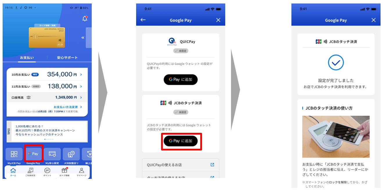 株式会社ジェーシービー (本社:東京都港区、代表取締役兼執行役員社長:二重 孝好、以下:JCB)は、2024年9月6日(金)より Google Pay でJCBのタッチ決済対応を開始しました。Android™ スマートフォンをお使いのお客様が Google Pay にJCBグループ(※)が発行するクレジットカード・デビットカードを登録すると、JCBのタッチ決済をご利用いただけます。また、これまでどおり、QUICPay(クイックペイ)™も  Google Pay でご利用いただけます。