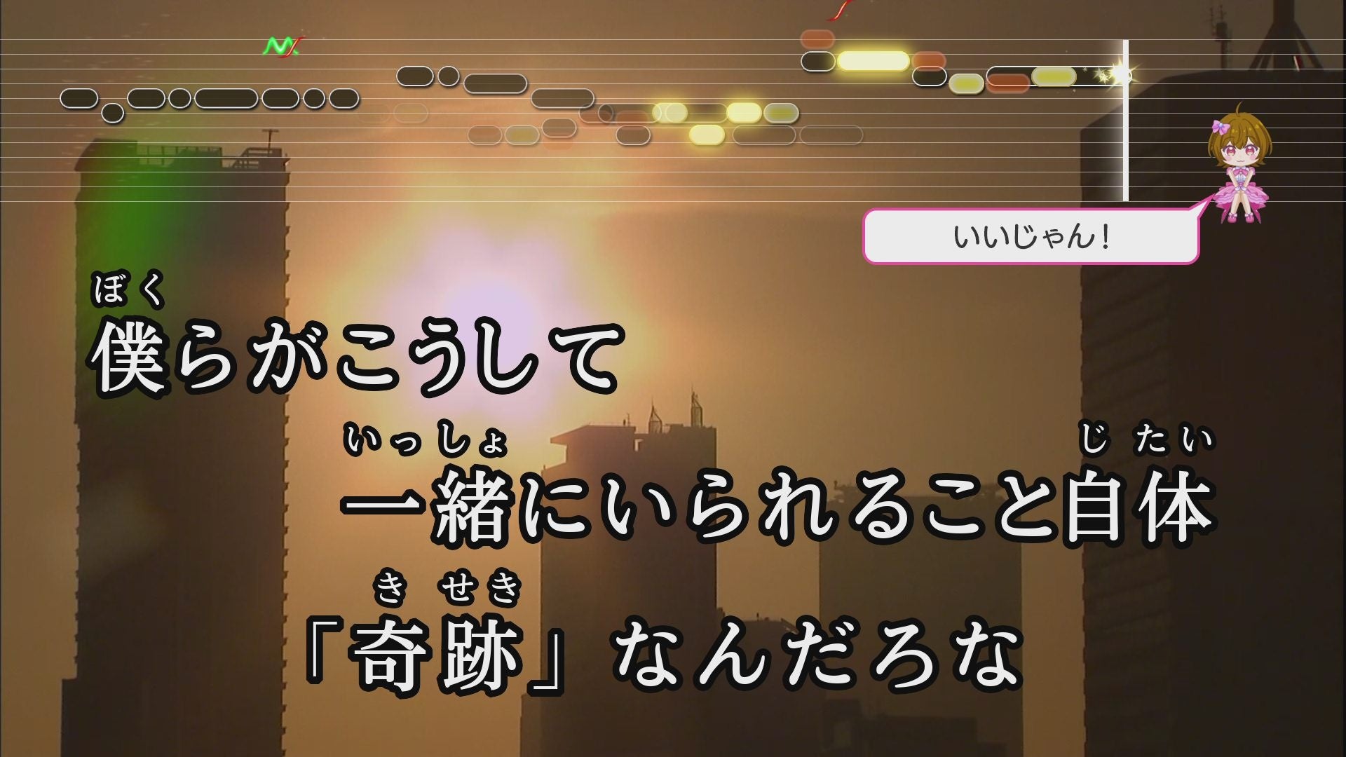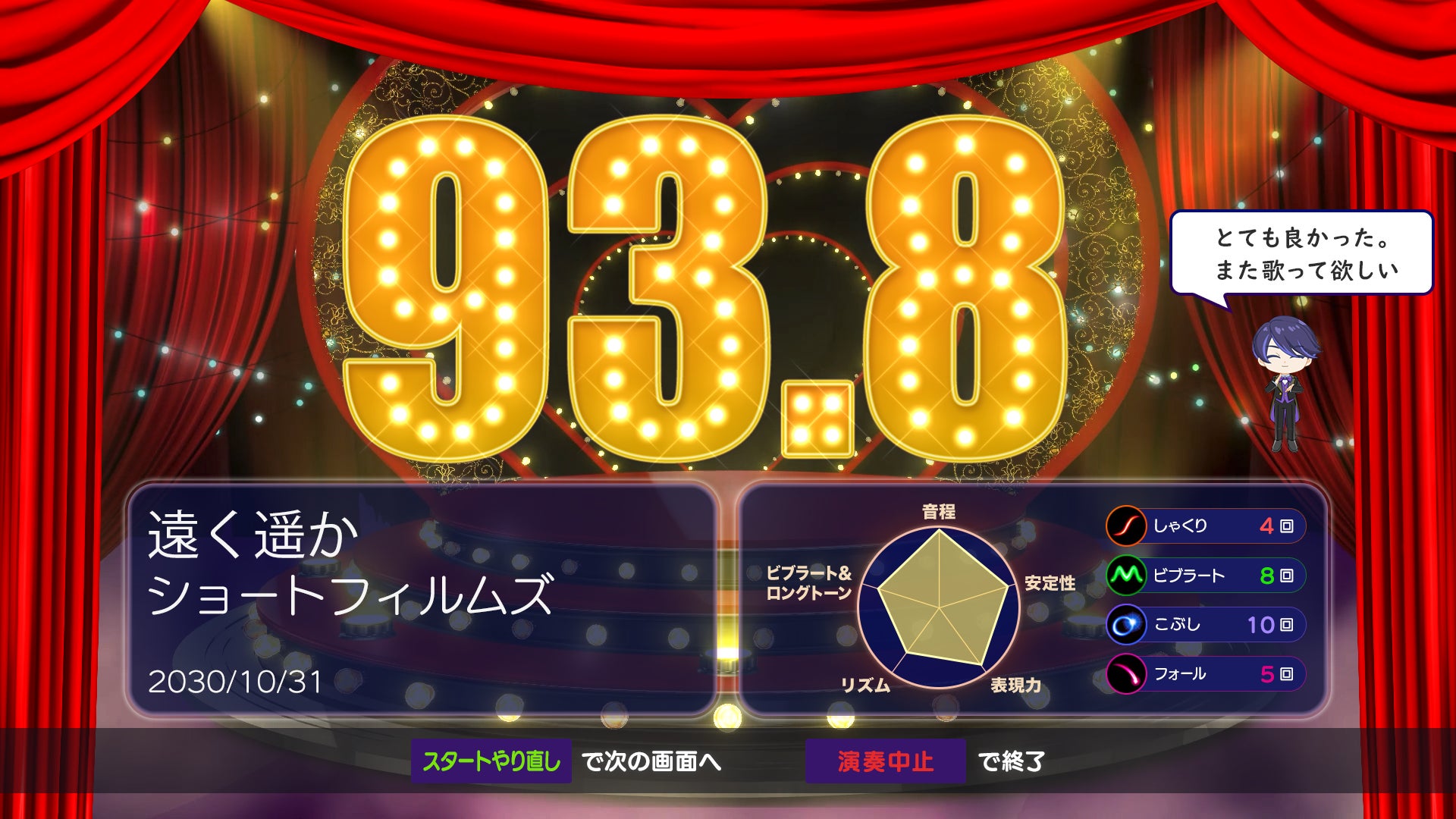 歌唱中はキャラクターがさまざまなコメントでほめてくれたり、盛り上げてくれます。点数に応じて結果がより豪華になっていくのも楽しみのひとつです。