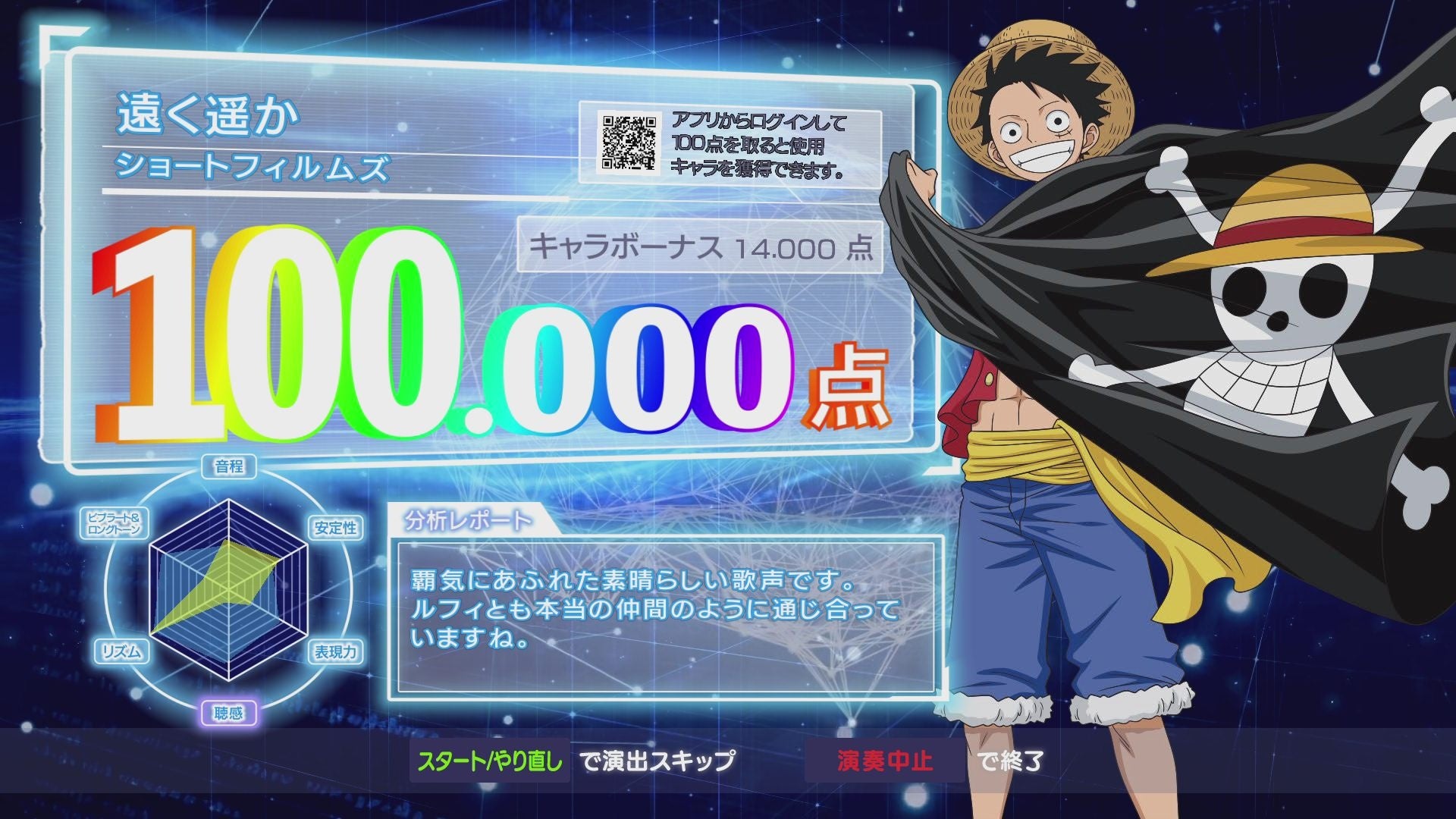 大人気TVアニメ『ONE PIECE』のキャラクターと精密採点が夢のコラボレーション。キャラクターの特長に合わせて歌うと点数アップのチャンス。ルフィたちと力を合わせて100点を目指しましょう。