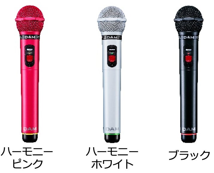 4本同時使用が可能。それぞれのマイクがLEDの色で区別できるので、自分のマイクがすぐに分かります。マイクのDAMボタンを押すと、声の高い人、低い人向けに最適な音質に切り替えられる機能を付加しました。