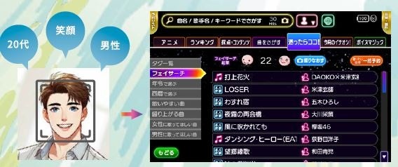 デンモクアプリで人気の検索機能がデンモク本体でも使えるようになりました。本体内蔵のカメラを使って撮影したユーザーの顔から年代を推定し、表情からおすすめ楽曲を表示します。