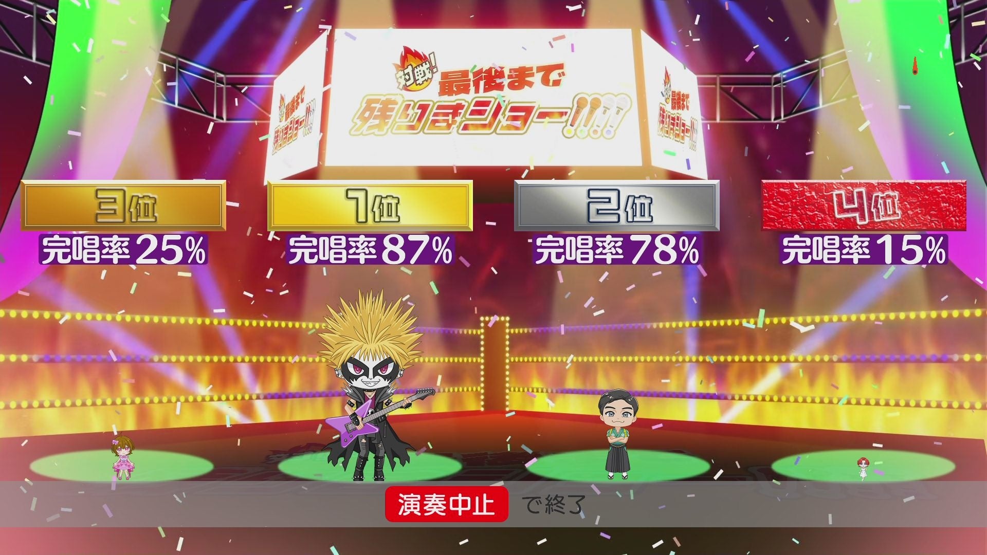 人気コンテンツ「完唱!歌いきりまショー!!」に最大4人同時対戦版が誕生。1曲をみんなで歌い、審査員に脱落させられることなく最後まで残ったユーザーが勝利となる、スリリングで盛り上がること間違いなしのパーティーゲームです。