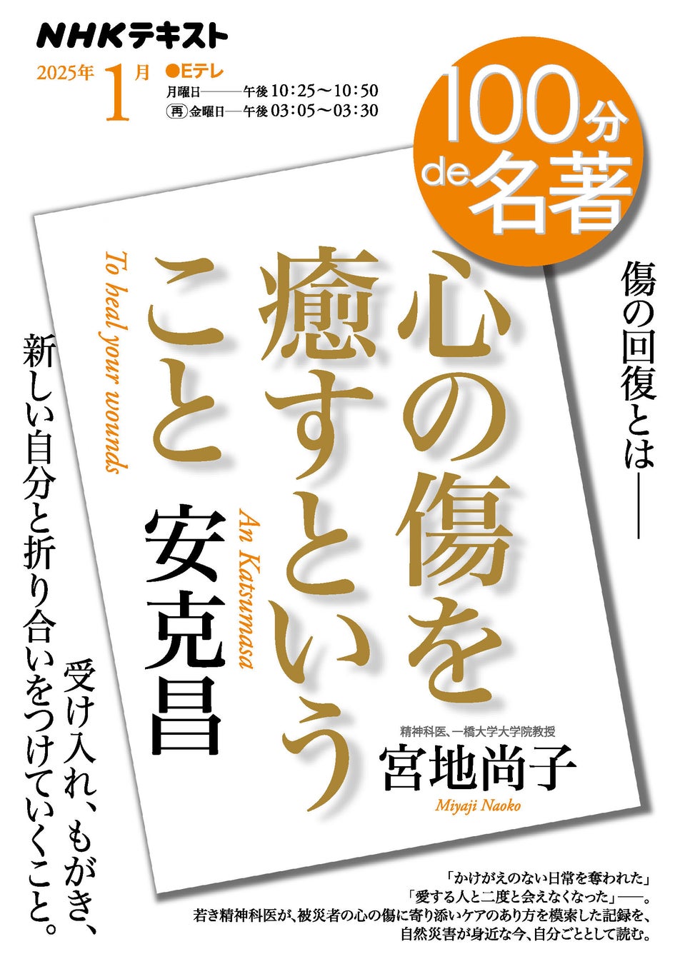 NHK Eテレにて好評放送中のNHK「100分de名著」。2025年1月のテーマは、精神科医・安克昌さんが阪神・淡路大震災で自ら被災しながらも多くの被災者に寄り添い続けた記録『心の傷を癒すということ』です。番組では宮地尚子さんが講師として毎週登場し、本書ともかかわりの深い「人の心の傷はどのように癒されるのか」「そばにいる人には何ができるのか」という「心のケア」の実際について考えます。(2025年1月6日より放送予定)