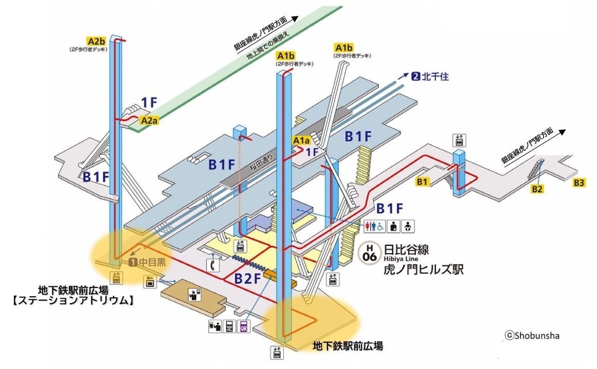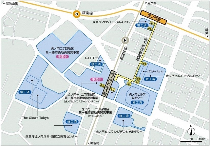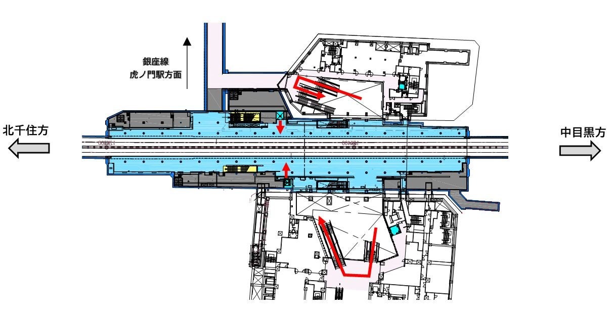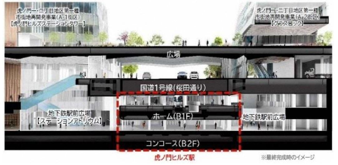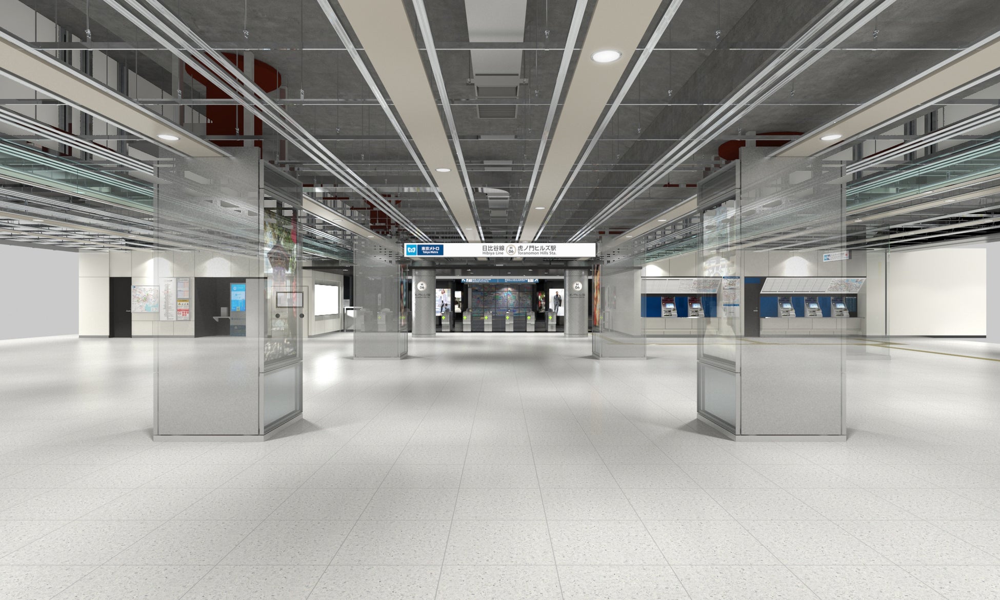 東京2020 オリンピック・パラリンピック競技大会に合わせ、2020年6月より暫定的な出入口を設けた新駅として開業してきましたが、このたび、日比谷線ホーム下に位置する地下2階部分に、現状の倍以上の幅員となる通路(コンコース)と改札を新設することで、当駅を介して虎ノ門ヒルズ ステーションタワーとグラスロック、そしてその先のまちへと行き来できるようになり、「駅まち一体」のまちづくりが実現します。