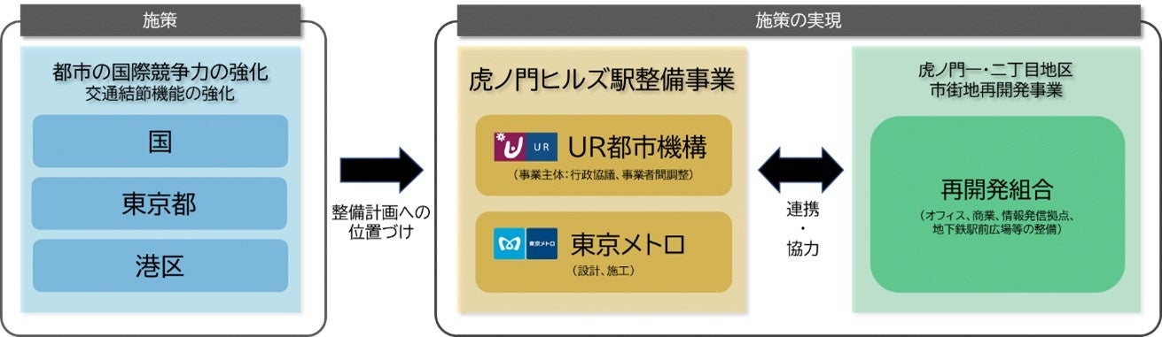 その実現に向け、UR都市機構が事業主体となって関係者間調整を行い、既存営業路線の安全運行を確保しながらの駅整備を東京メトロが担い、駅に隣接する虎ノ門ヒルズ ステーションタワー(A-1街区)、グラスロック(A-2街区)の施行者である虎ノ門一・二丁目地区市街地再開発組合と連携し、協力を得ながら実施してまいりました。