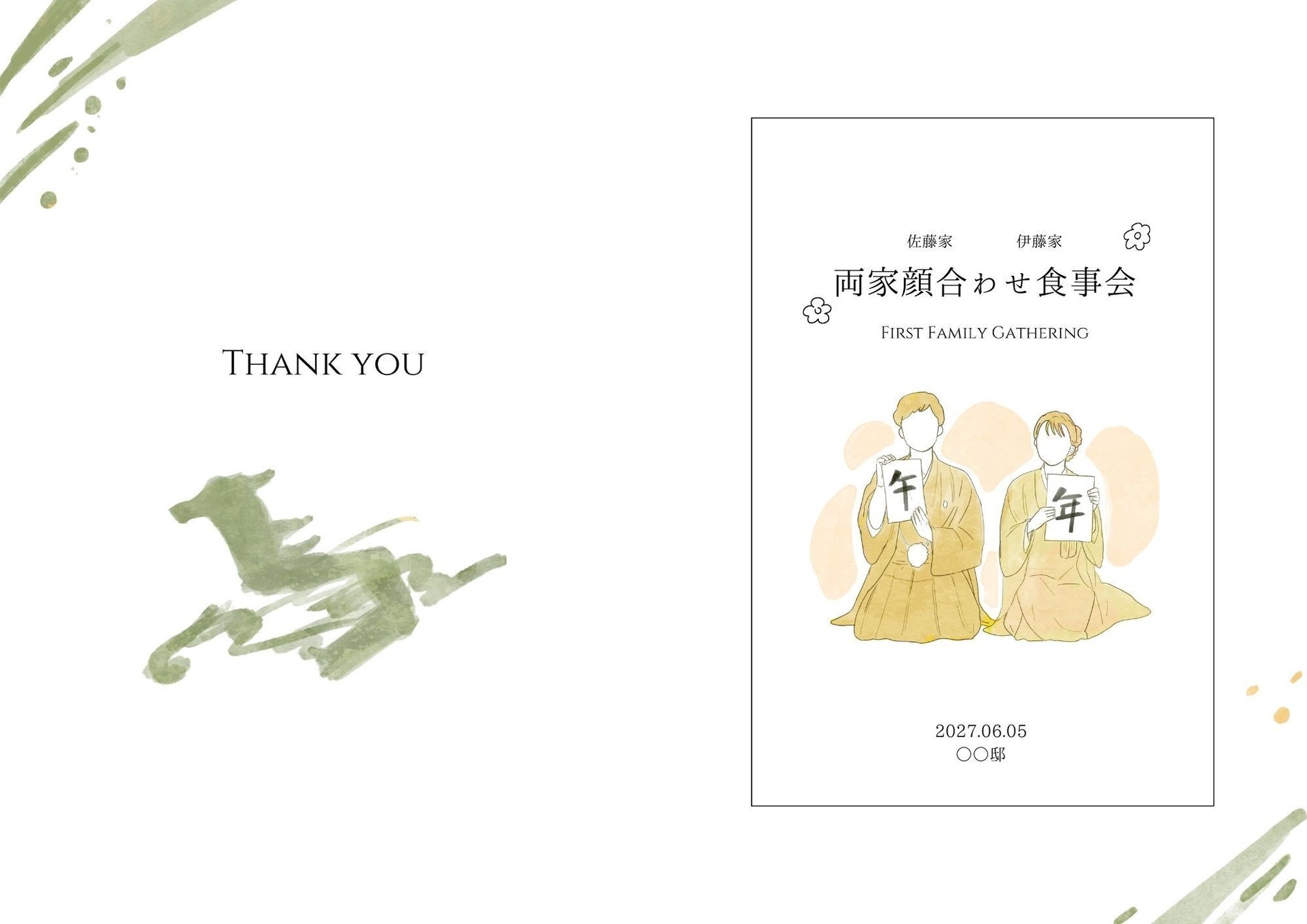 「午年」に因んで午年と書かれた紙を持ったお二人と、筆で描かれた馬が並ぶデザイン。勢いよく駆ける馬は、ふたりの未来が力強く進んでいく姿を表しています。