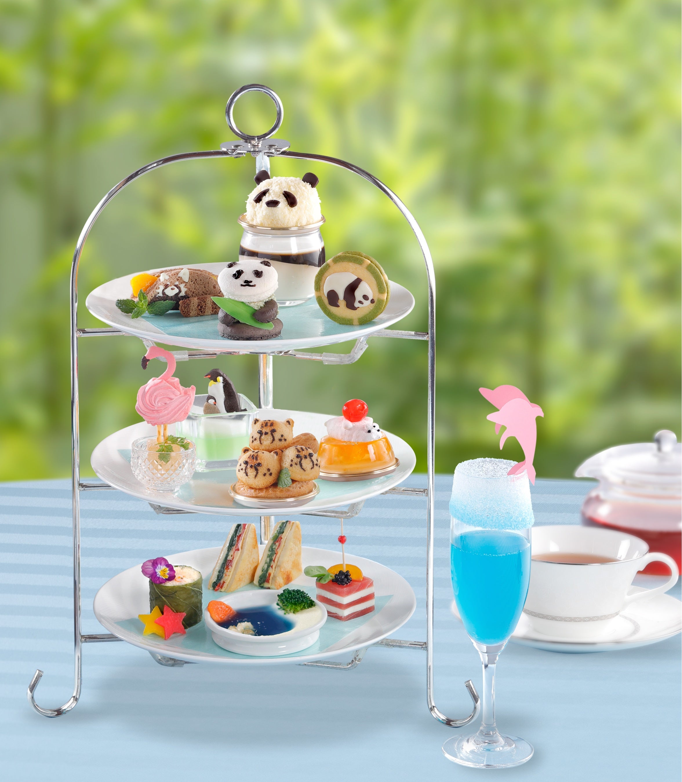 7頭のジャイアントパンダをはじめとしたさまざまな動物たちがいきいきと暮らすアドベンチャーワールドの魅力を、まるごとアフタヌーンティー形式に詰め込んだ期間限定の特別メニューです。誰もが笑顔になれる「Smile」をテーマに、白浜で穏やかに過ごす動物たちの表情や動きをホテルのパティシエがスイーツで表現し、夏のエンターテインメントに仕立てました。