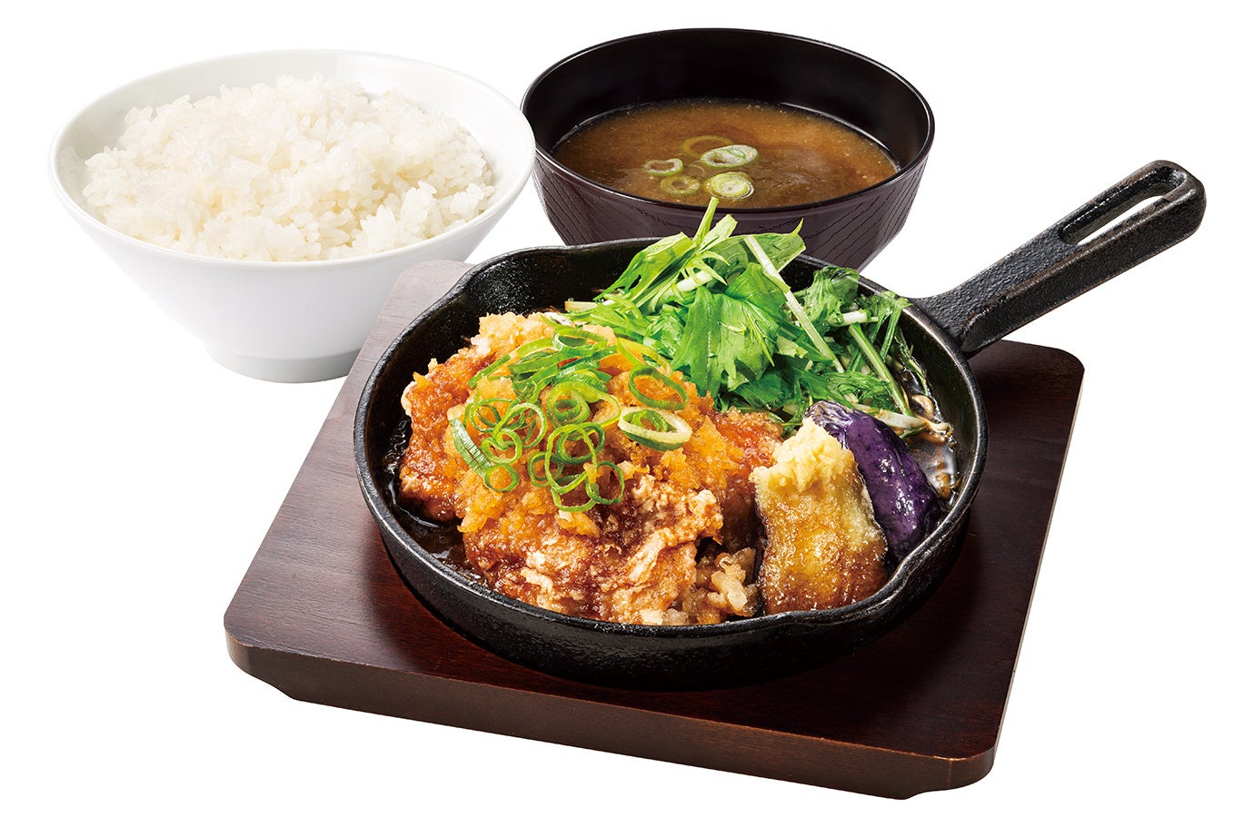 からやまで冬の定番となっている「生姜からあげ」を、熱々のみぞれ鍋と合わせて温かさにホッとする一品に仕立てました。甘めのタレをたっぷり含んだ大根おろしを生姜からあげや茄子に絡めれば、白米がどんどんすすむ冬の鍋定食です。