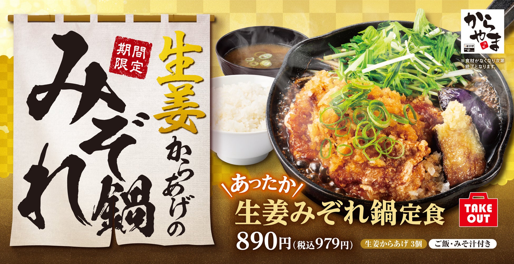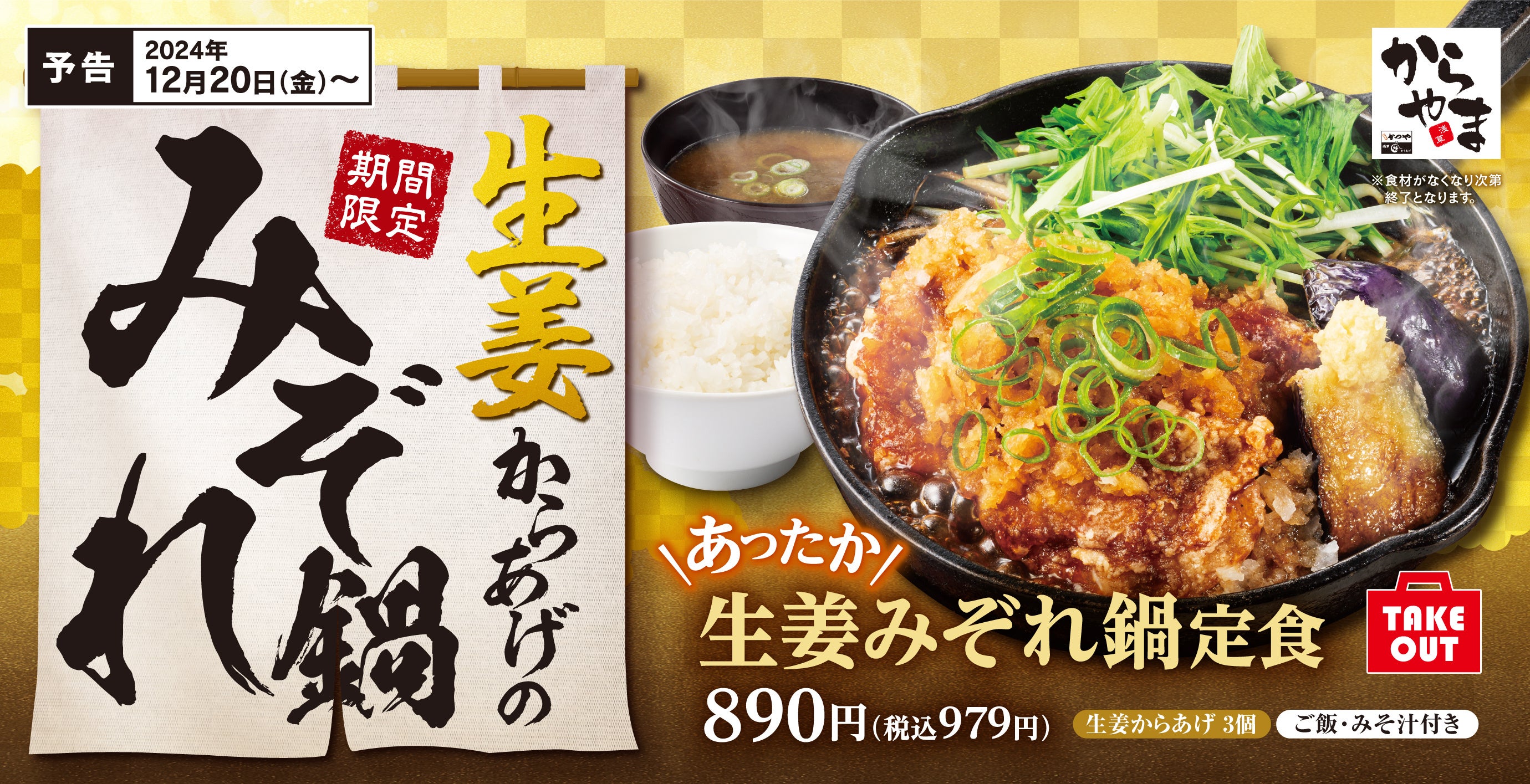とんかつ専⾨店「かつや」などを展開するアークランドサービスホールディングス株式会社の⼦会社、エバーアクション株式会社(本社:東京都千代⽥区/代表:渡部 貴、以下当社)は、2024年12⽉20⽇(金)より国内の「からやま」にて「生姜みぞれ鍋定食」を、「からあげ縁」にて「生姜からあげ」を期間限定で販売開始いたします。
