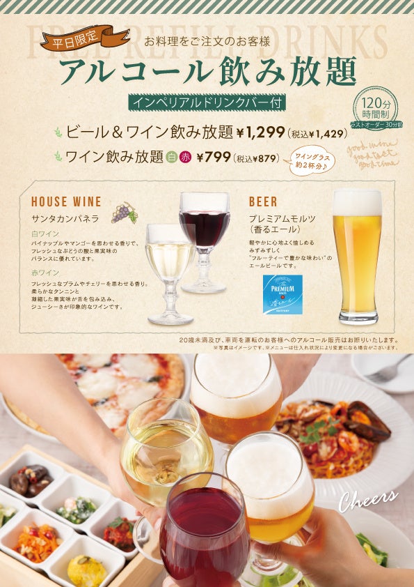 【イタリアン リゾート ペルティカ 小平】平日限定♪お得に飲み放題!生パスタや自家製ローストビーフなど多彩なお料理とともにビールとワインで乾杯!120分制の飲み放題が1,429円にて新登場!