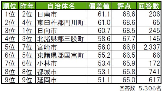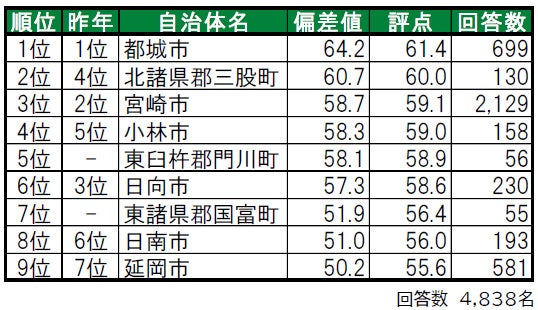 住み続けたい街1位は、2年連続で都城市。2位北諸県郡三股町、3位宮崎市。