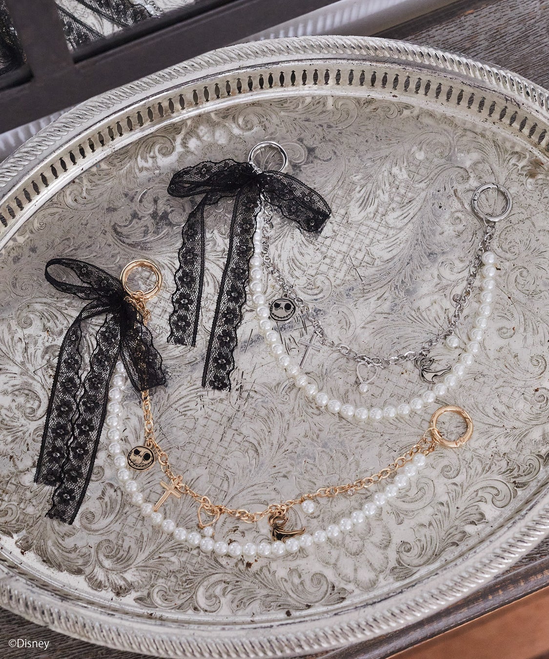 そのほか、トレンドのチャームも2種類ラインアップ。「ジャック」や「ゼロ」のミニプレートとパールにレースリボンを組み合わせたフェミニンなチャームと、キャラクターとフリンジがポイントのカジュアルなデザインをご用意しております。