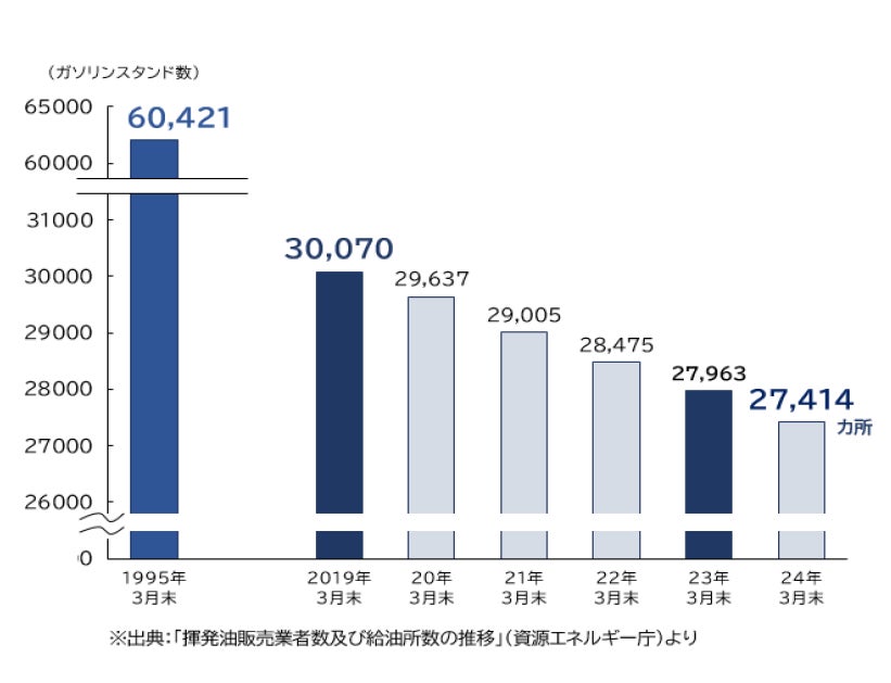 資源エネルギー庁の調べによると、1995年3月末に60,421カ所あった揮発油販売業者数及び給油所数は、24年後の2019年3月末には30,070カ所に半減し、その後も緩やかに減少が続き、2024年3月末には27,414カ所となった。