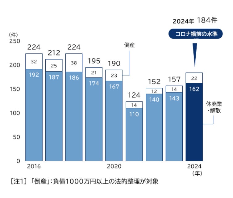 2024年のガソリンスタンドの倒産・休廃業件数は184件だった。3年連続で増加し、コロナ禍前の水準に迫りつつある。