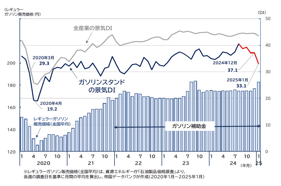 また、2025年1月のガソリンスタンドの景気DIは前月比4.0ポイント減の33.1と、コロナ禍以降最大の下落幅を記録し、ガソリンスタンドの経営環境は厳しさを増している。