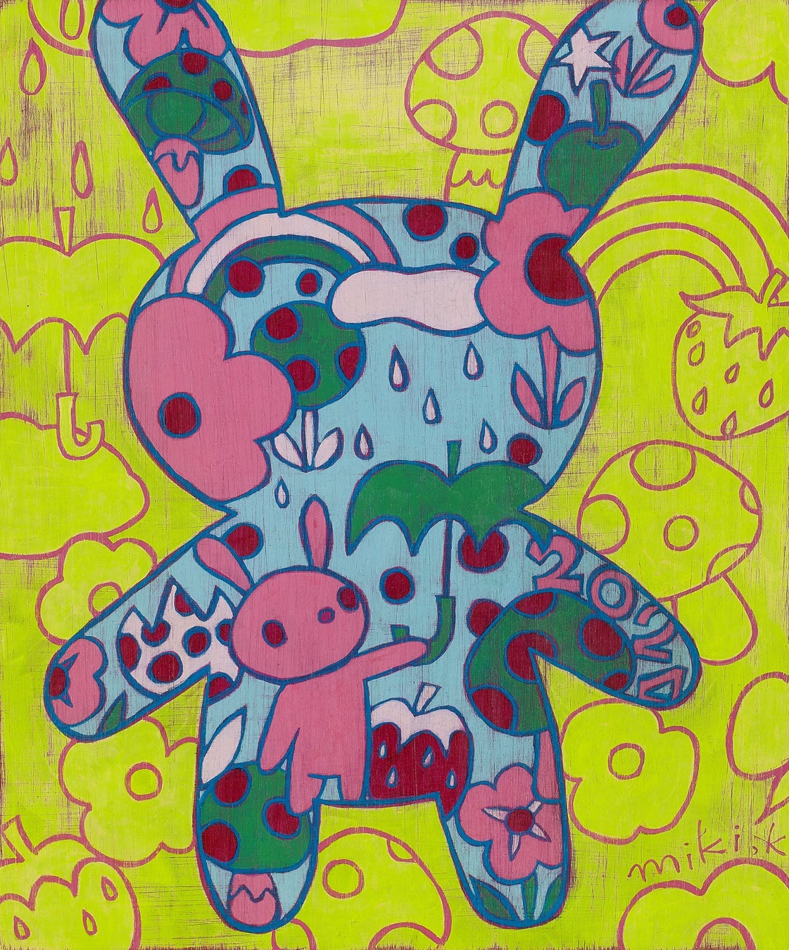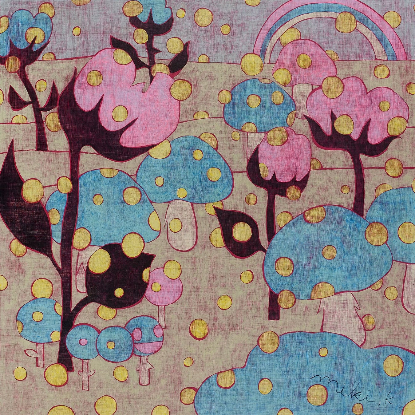 仮屋美紀は、うさぎや花、キノコなどをモチーフに、おとぎ話のような世界をポップな色使いで描いています。作品にたびたび登場するうさぎには、あえて表情を描かず、鑑賞者に想像の余地を与えています。木製パネルの上に丁寧にアクリル絵具を塗り重ね、その部分を削ることで生まれる独特な風合いが、幼少期に過ごした緩やかで懐かしい時間を感じさせるようでもあります。
