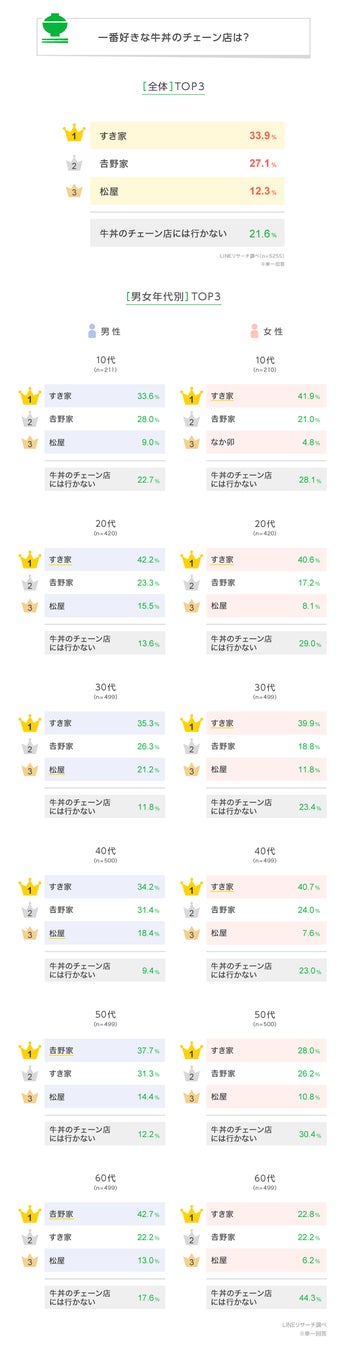 LINEリサーチ、全国10~60代の男女を対象に、牛丼チェーン店に関する調査を実施