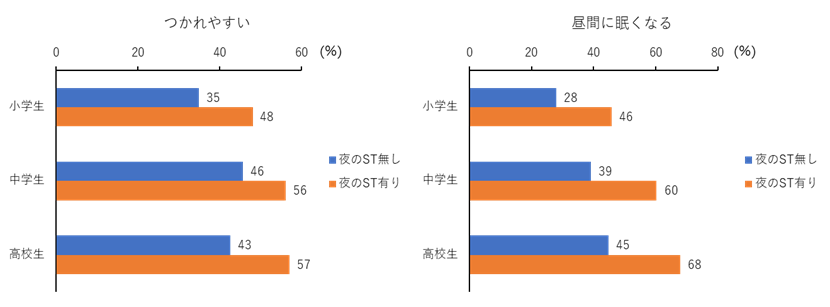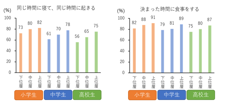 小学4年生から高校3年生までを対象とした調査の結果、学年が上がるにつれて生活リズムの乱れが増加する傾向にありました。また、精神的な健康状態・成績が良い子どもは、普段から規則正しい生活をしている傾向がみられました。