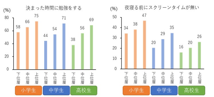 それぞれの学校段階において、成績が上位の子どもは、成績が下位の子どもに比べて、普段から規則正しい睡眠、食事、学習習慣があると回答し、生活リズムの規則正しさと成績とに正の関連がみられました。また、成績が上位の子どもは、成績が下位の子どもに比べて、寝る前のスクリーンタイムが無いと回答する傾向もみられました。普段からなるべく規則正しい生活リズムを心掛けることが重要だと考えられます。