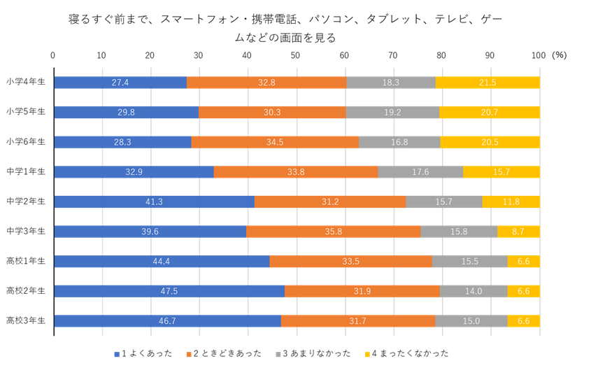 今回の調査から、寝る前のスクリーンタイムは、学年が上がるごとに増える傾向があることが明らかとなりました。テレビやパソコン、スマートフォンのディスプレイから発せられる光には、青色の波長帯が多く含まれており、寝る前の青色光暴露は、メラトニン(睡眠誘発ホルモン)の分泌を抑制し、体内時計の夜型化をもたらすと言われています。また、夜寝る前にスクリーンタイムがあると答えた子どもは、無いと答えた子どもに比べて、「つかれやすい」「昼間に眠くなる」と答えた割合が高く、夜寝る前のスクリーンタイムは睡眠の妨げになるだけでなく、日中の活動にも影響していると考えられます。