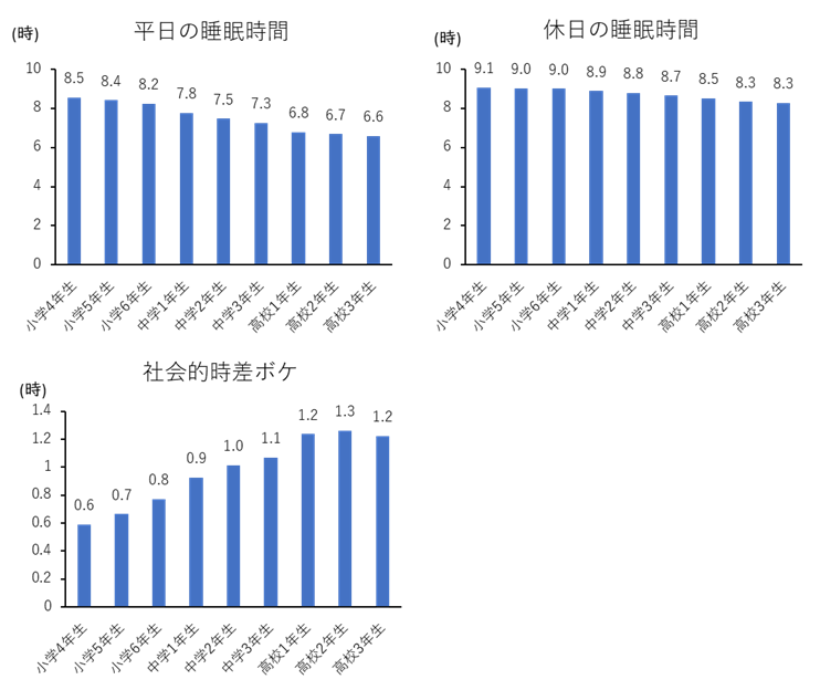 平日・休日とも睡眠時間は、学年が上がるにつれ減少しています。特に高校3年生の平日の睡眠時間は平均6時間36分となっていました。一方で、休日は8時間以上寝ていることからも、平日にたまった睡眠不足(睡眠負債)を休日に寝だめして解消していることが分かります。その結果、平日と休日の生活リズムの時刻差(「社会的時差ボ ケ」と呼ばれる)が平均で1時間を超えていました。