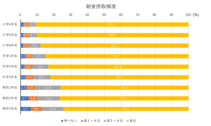 今回の調査では、毎日朝食を食べない子どもは、学年が上がるごとに増加する傾向がみられ、高校3年生では毎日食べる子どもは全体の74.7%まで低下していることが分かりました。