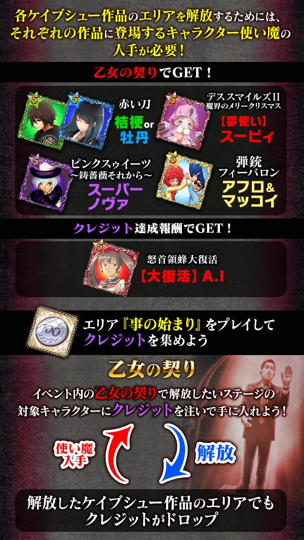 手に入れた「クレジット」をイベント画面内にある「乙女の契り」ボタンから注ぐことで、各作品に登場するキャラクター使い魔を手に入れることができます。また、手に入れたキャラクターが登場するケイブ作品のエリアが解放され、対象のステージを遊ぶことができるようになります。