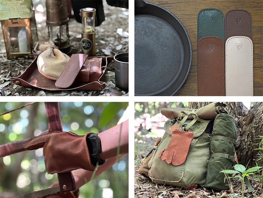 猪革のスキレットハンドルカバー、猪革のトリガーミトン手袋、猪革の△コインケース、猪革のランタンシェード、ほか