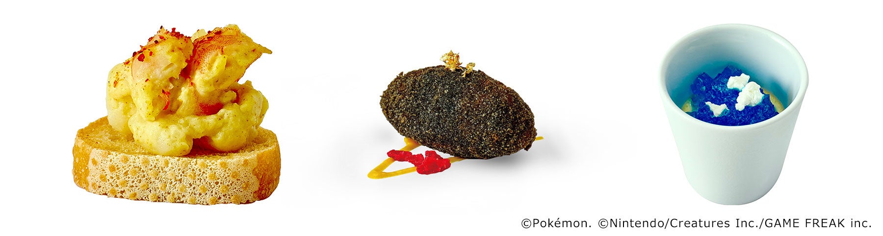 また、セイボリーは、 “ブースター”のもこもこ感を表現したカレー風味のブルスケッタ、ソースや素材で“ブラッキー”の見た目を表現したアランチーニ、いつも涼しげな“グレイシア”を表現したブルージュレの乗ったロワイヤルの3種をお楽しみいただけます。
