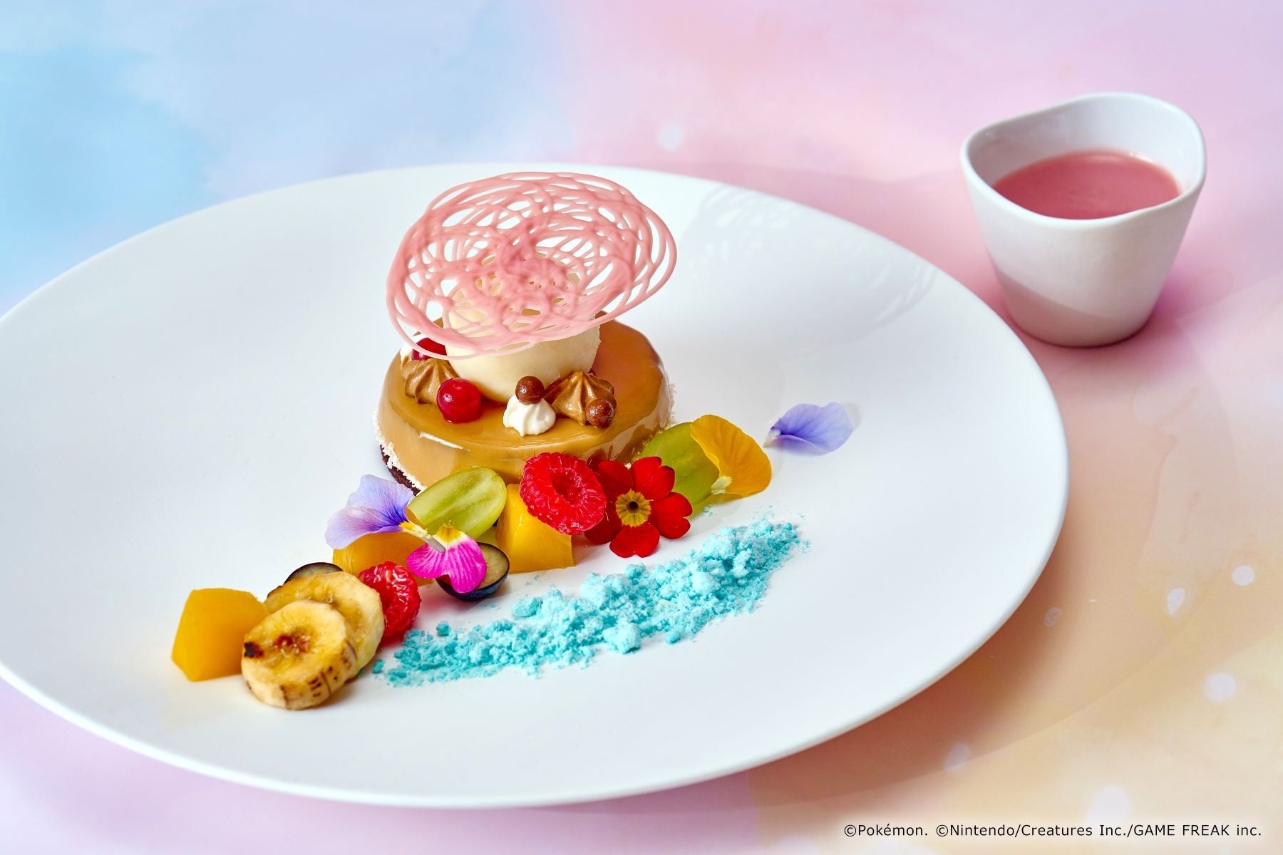 一皿でイーブイからニンフィアへの進化を表現した特製スイーツ。