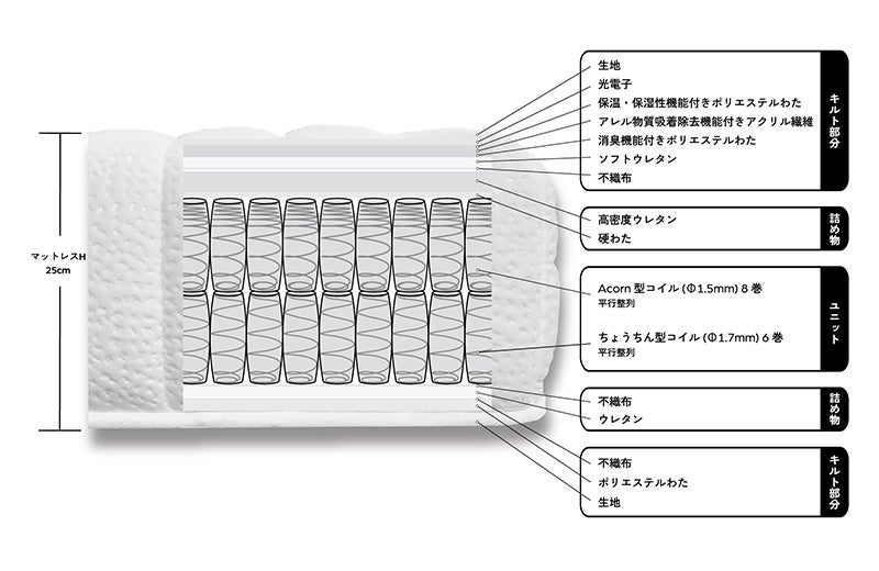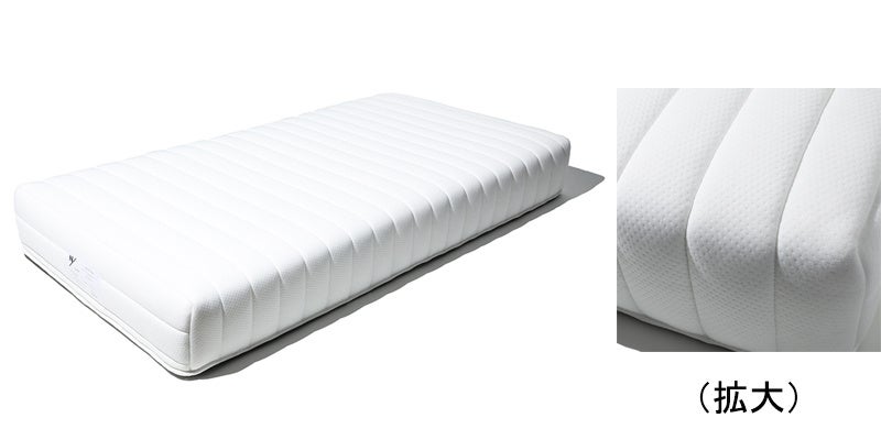 「ENNN / MATTRESS」は、こだわりの8層構造とコイルのダブルクッション構造。8層構造には、快適な温度に保つ「光電子®」(※1)素材や、消臭や防虫効果などの清潔さを保つ素材、そしてムレを軽減抑制するための通気を確保する高密度ウレタンを採用しています。マットレスの大部分を占めるコイルは、上段に柔らかさのある8巻コイル、下段に上段の柔らかさをしっかりと支える6巻コイルを使用。包まれるような柔らかさを維持しつつ、一つひとつのコイルが体全体を支えることで、底つき感のない安心感ある寝心地をサポートします。