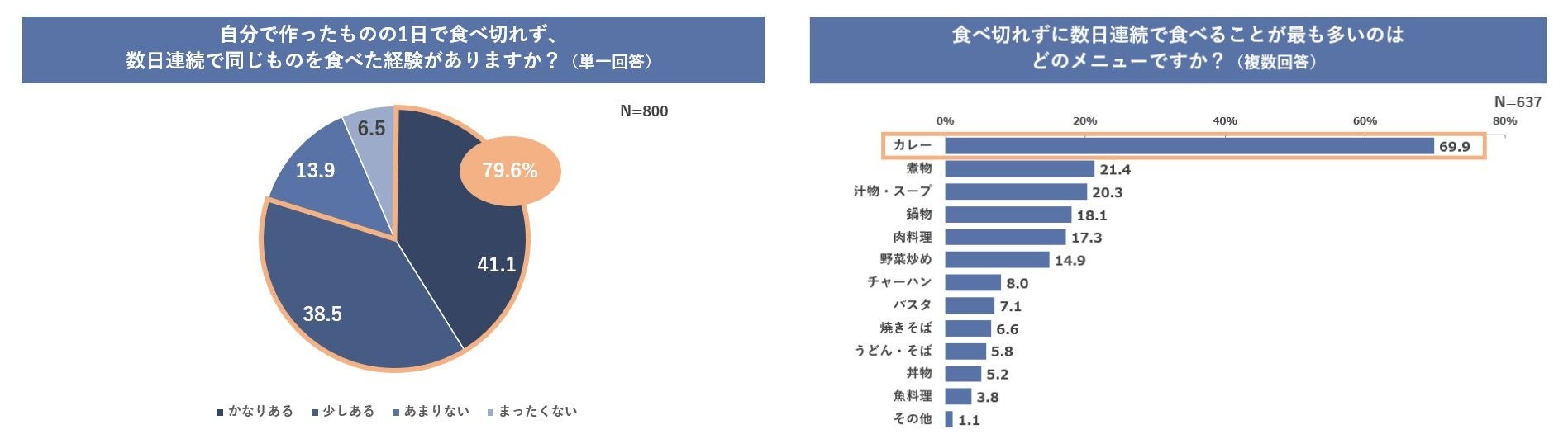自分で作った料理を1日で食べ切れず、数日連続で同じものを食べた経験がある人は約8割。中でも最もそのパターンが多いのは「カレー」がダントツ