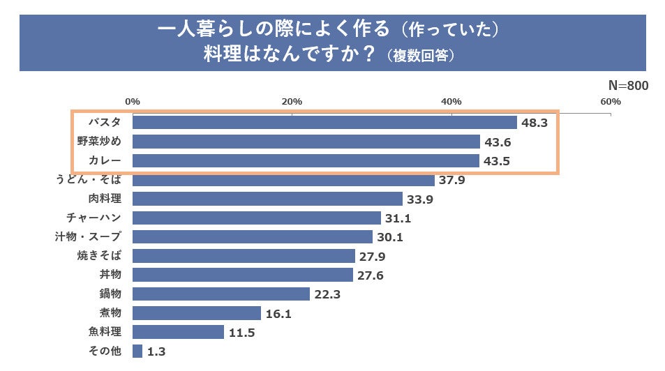 一人暮らしでよく作っていたメニュー1位は「パスタ」48.3%、2位「野菜炒め」43.5%、3位「カレー」43.5%